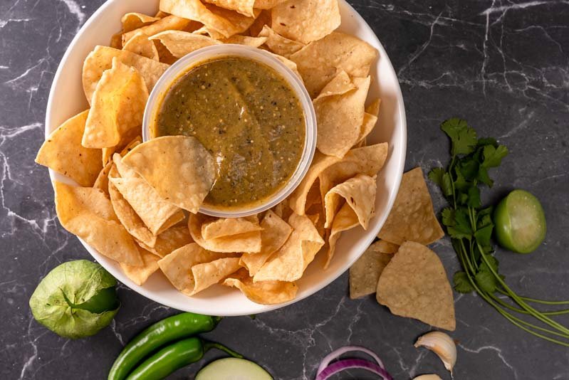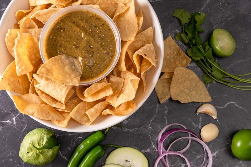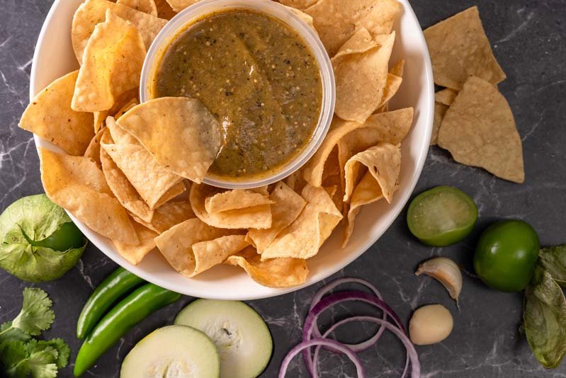 Serrano,zucchini,tomatillo,onion,garlic,cilantro and avocado oil – Mild to Medium